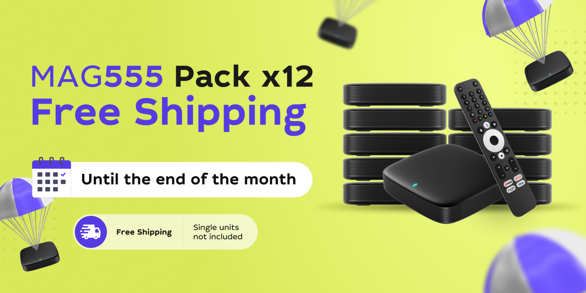 Infomir.store is introducing a special pricing offer for its customers: purchase a bundle of 12 MAG555 devices and receive free shipping. The promotion is valid through the end of April 2026 and provides an excellent opportunity to cost-effectively upgrade or scale your device fleet.
